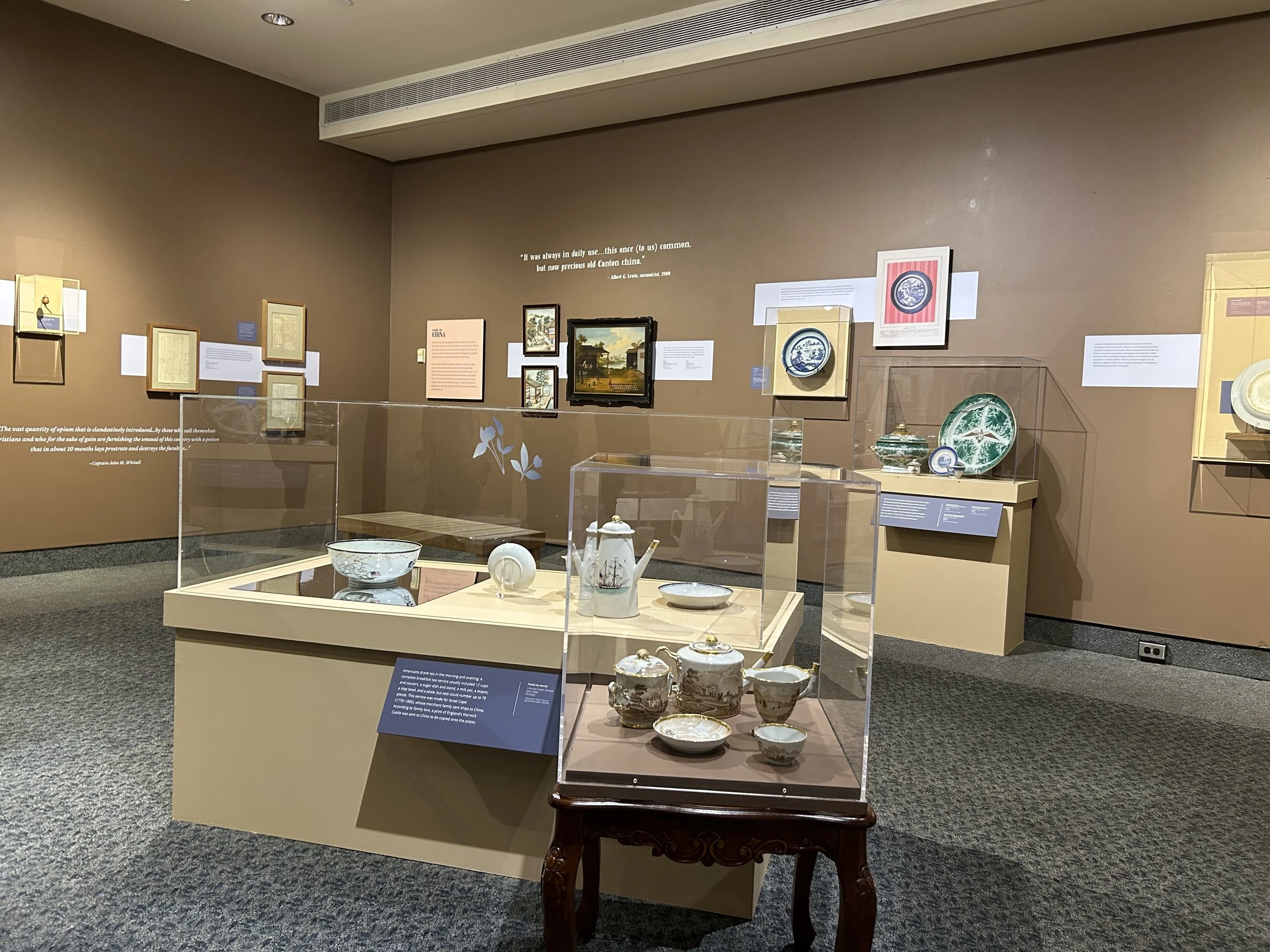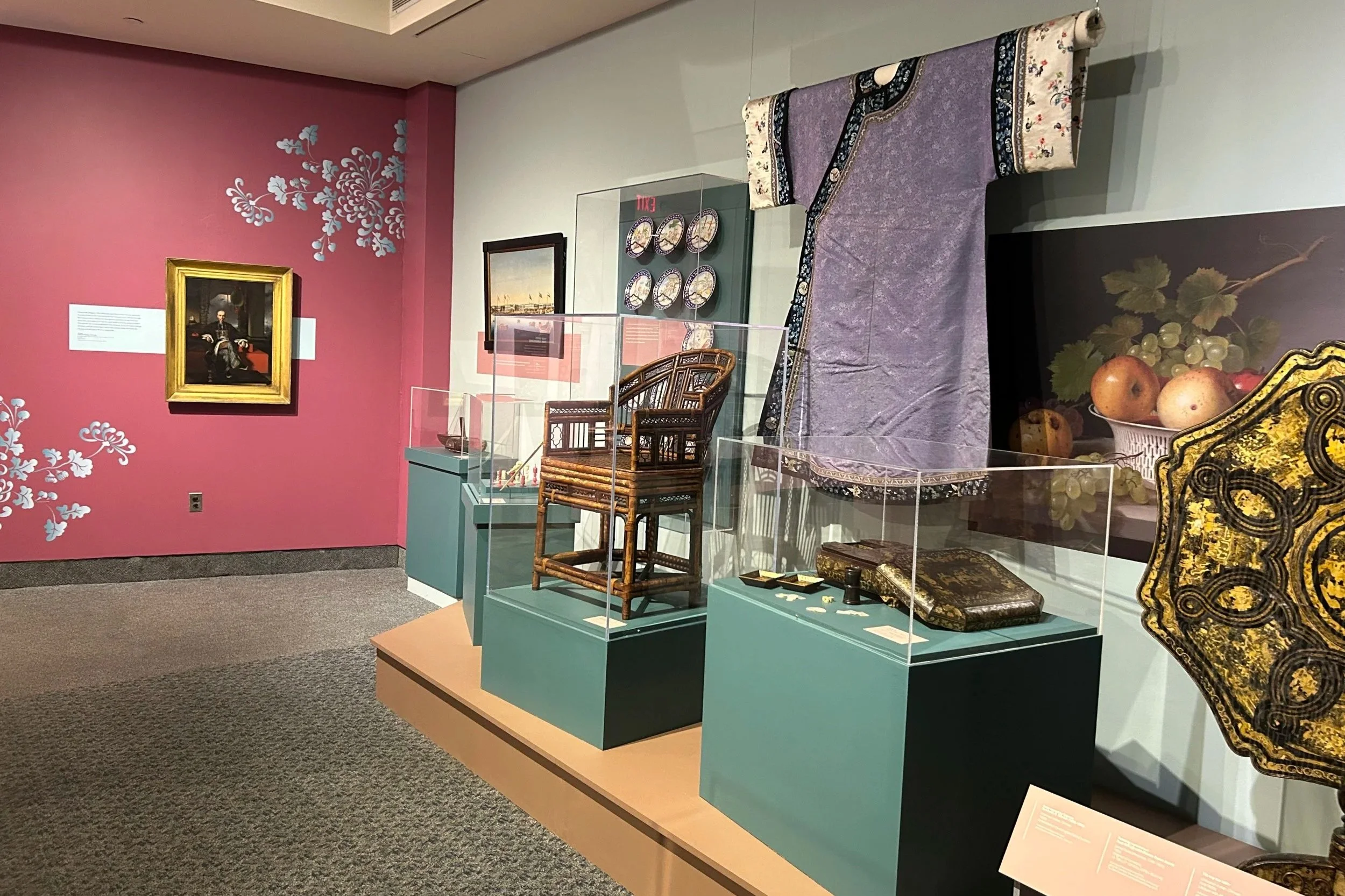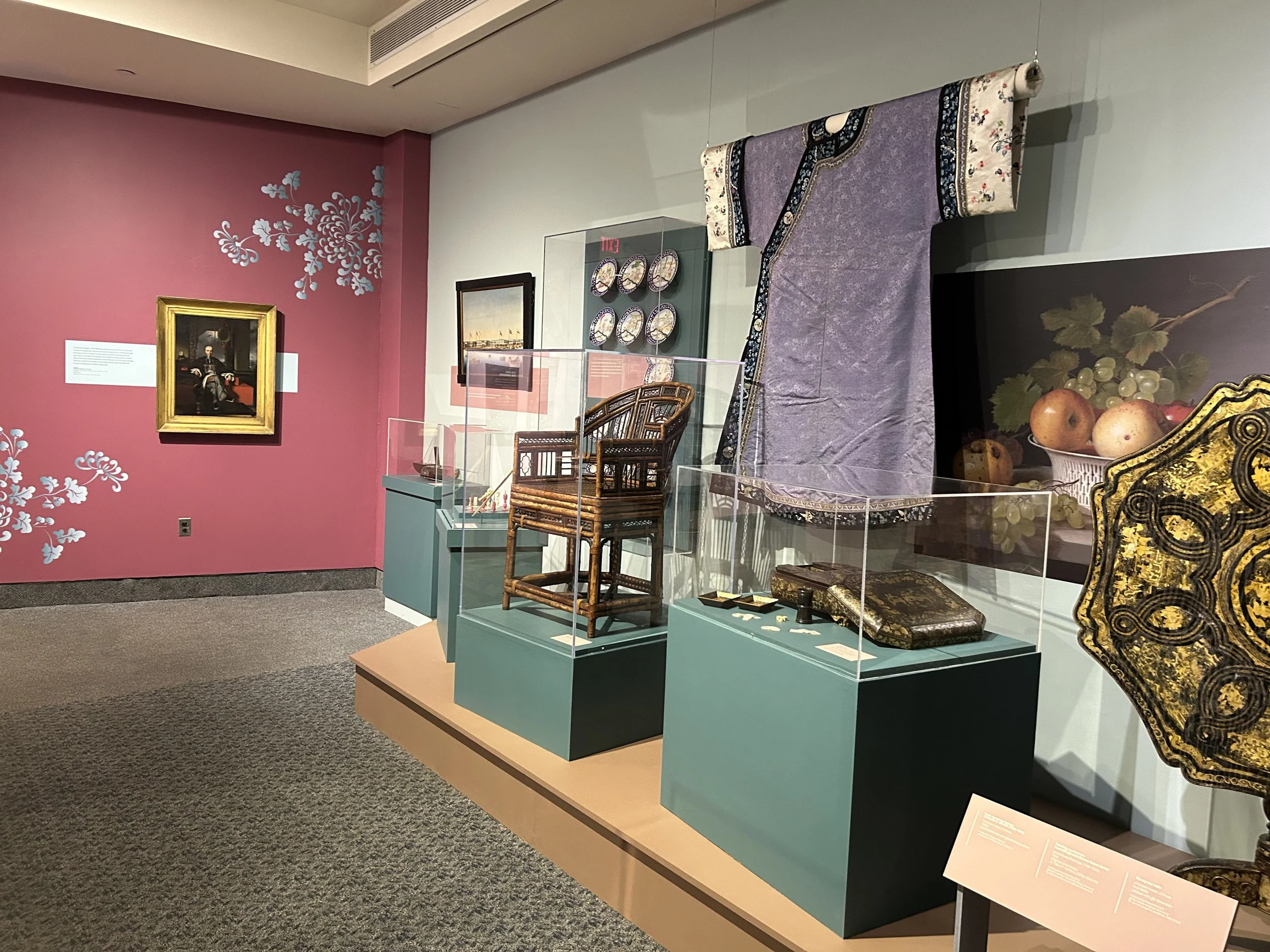 In addition to amazing artifacts from the Museum’s collection including documents Captain Green brought with him to China, beautiful porcelain, a stand-out portrait of the Chinese merchant Houqua, and one very fabulous red silk shawl, we borrowed several important items including a “States service” saucer owned by Martha Washington, and a “hong bowl” showing an image of the Empress of China.