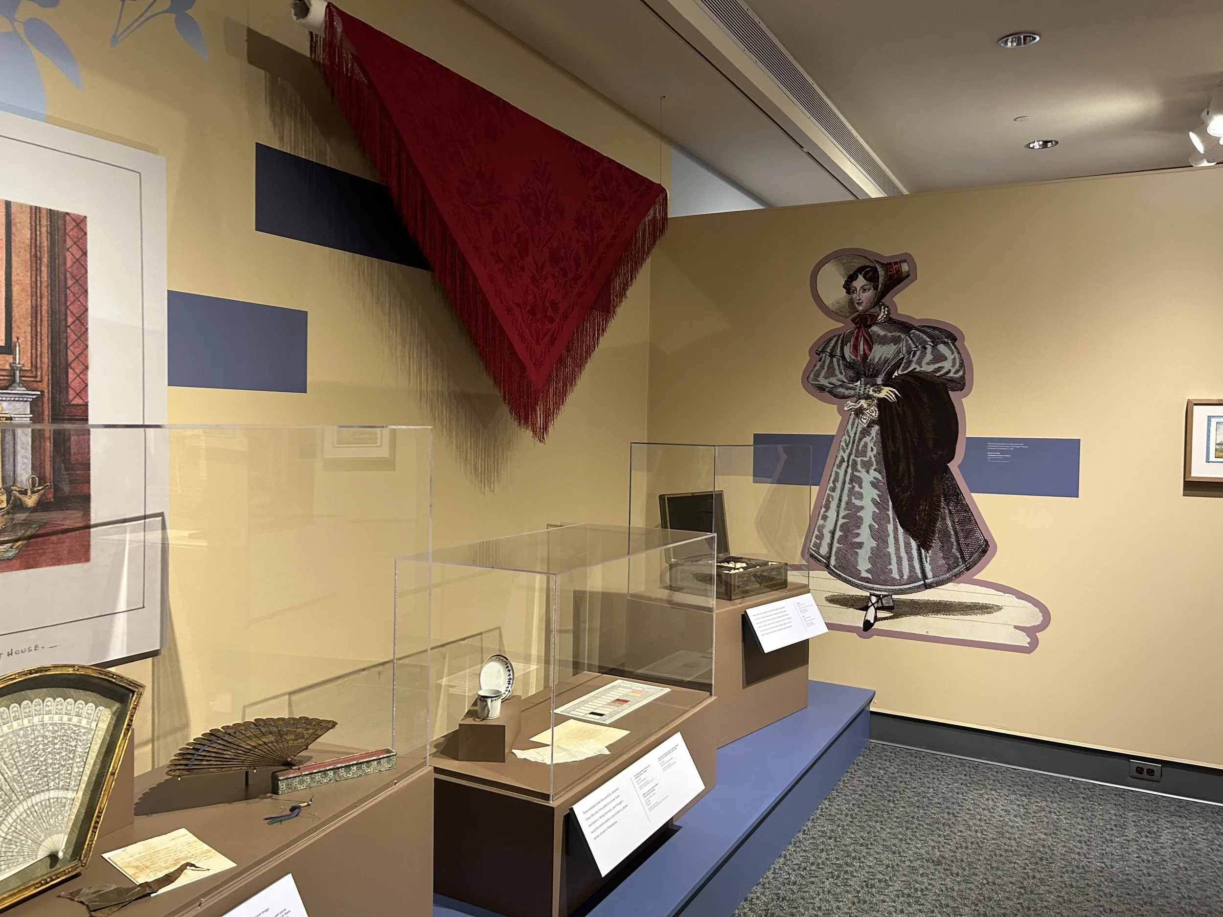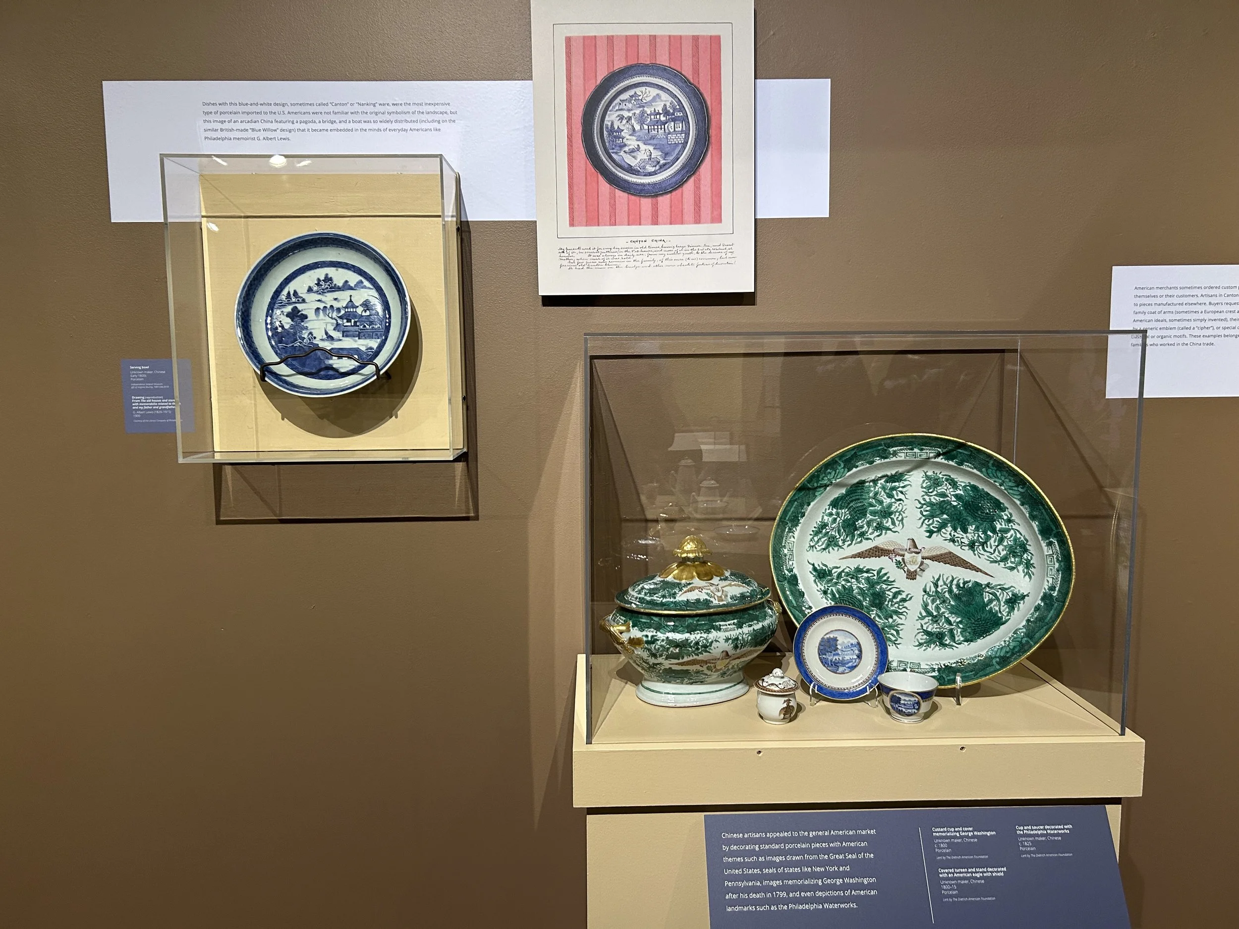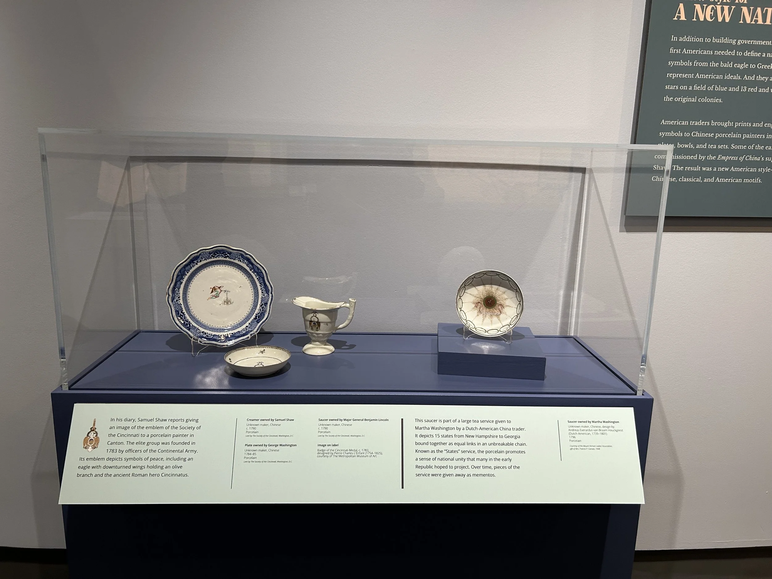 In addition to amazing artifacts from the Museum’s collection including documents Captain Green brought with him to China, beautiful porcelain, a stand-out portrait of the Chinese merchant Houqua, and one very fabulous red silk shawl, we borrowed several important items including a “States service” saucer owned by Martha Washington, and a “hong bowl” showing an image of the Empress of China.